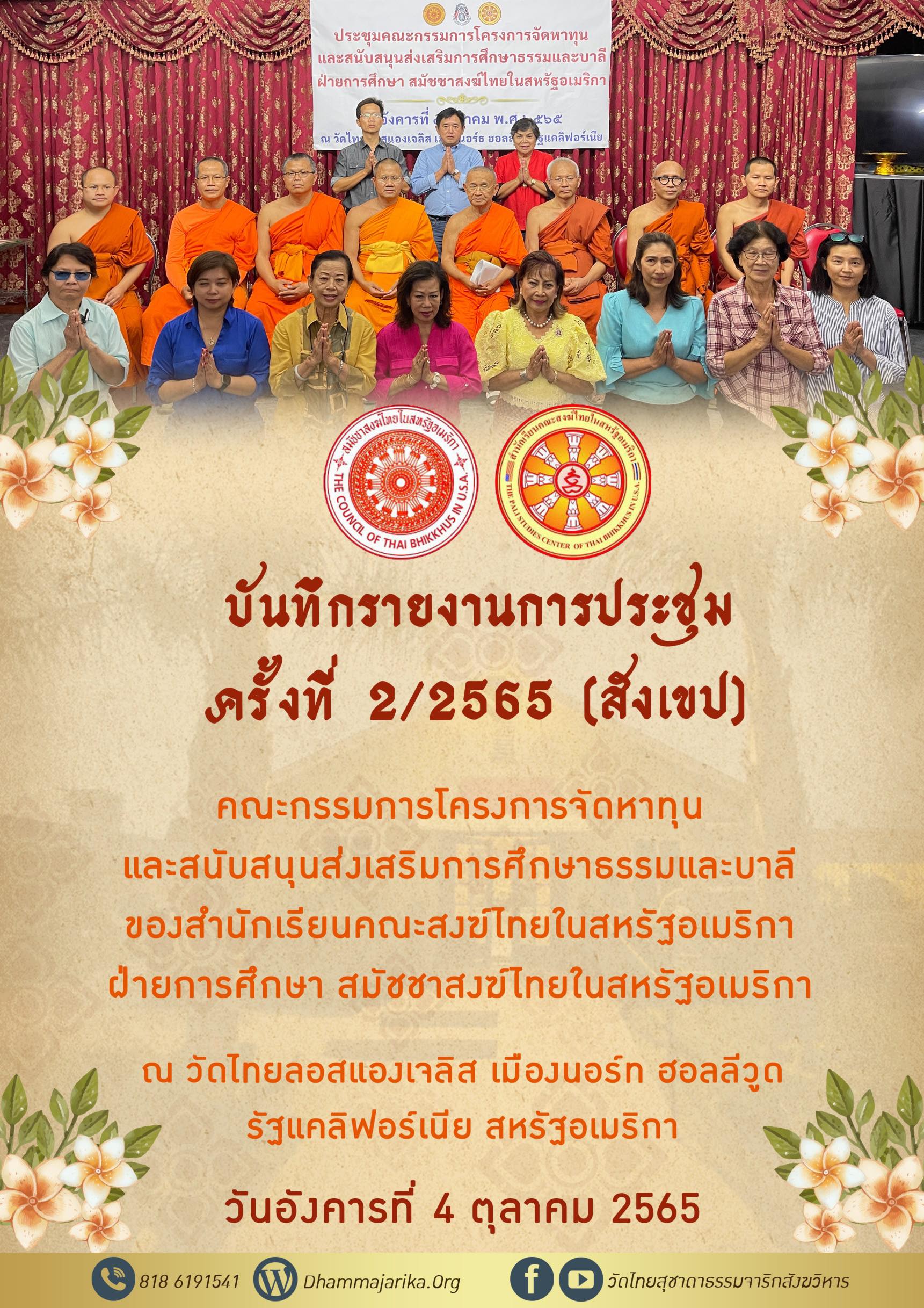 บันทึกรายงานการประชุม ครั้งที่ 2/2565 (สังเขป) คณะกรรมการโครงการจัดหาทุนและสนับสนุนส่งเสริมการศึกษาธรรมและบาลี ของสำนักเรียนคณะสงฆ์ไทยในสหรัฐอเมริกา ฝ่ายการศึกษา สมัชชาสงฆ์ไทยในสหรัฐอเมริกา ณ วัดไทยลอสแองเจลิส เมืองนอร์มฮอลลีวูด รัฐแคลิฟอร์เนีย วันที่ 4 ตุลาคม 2565 ……….……………………………………