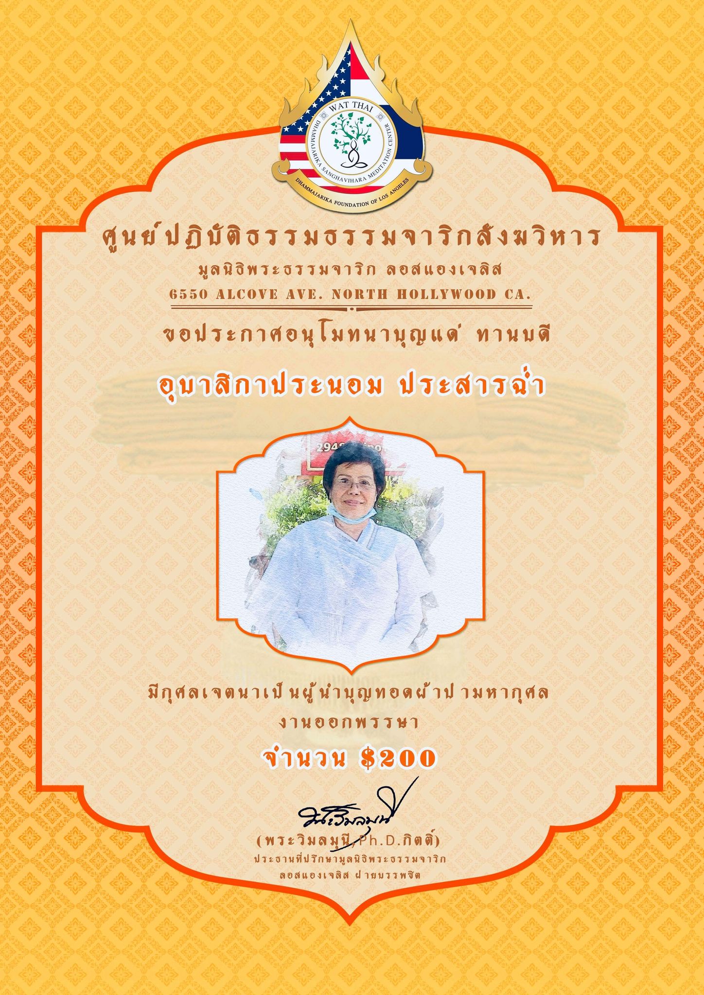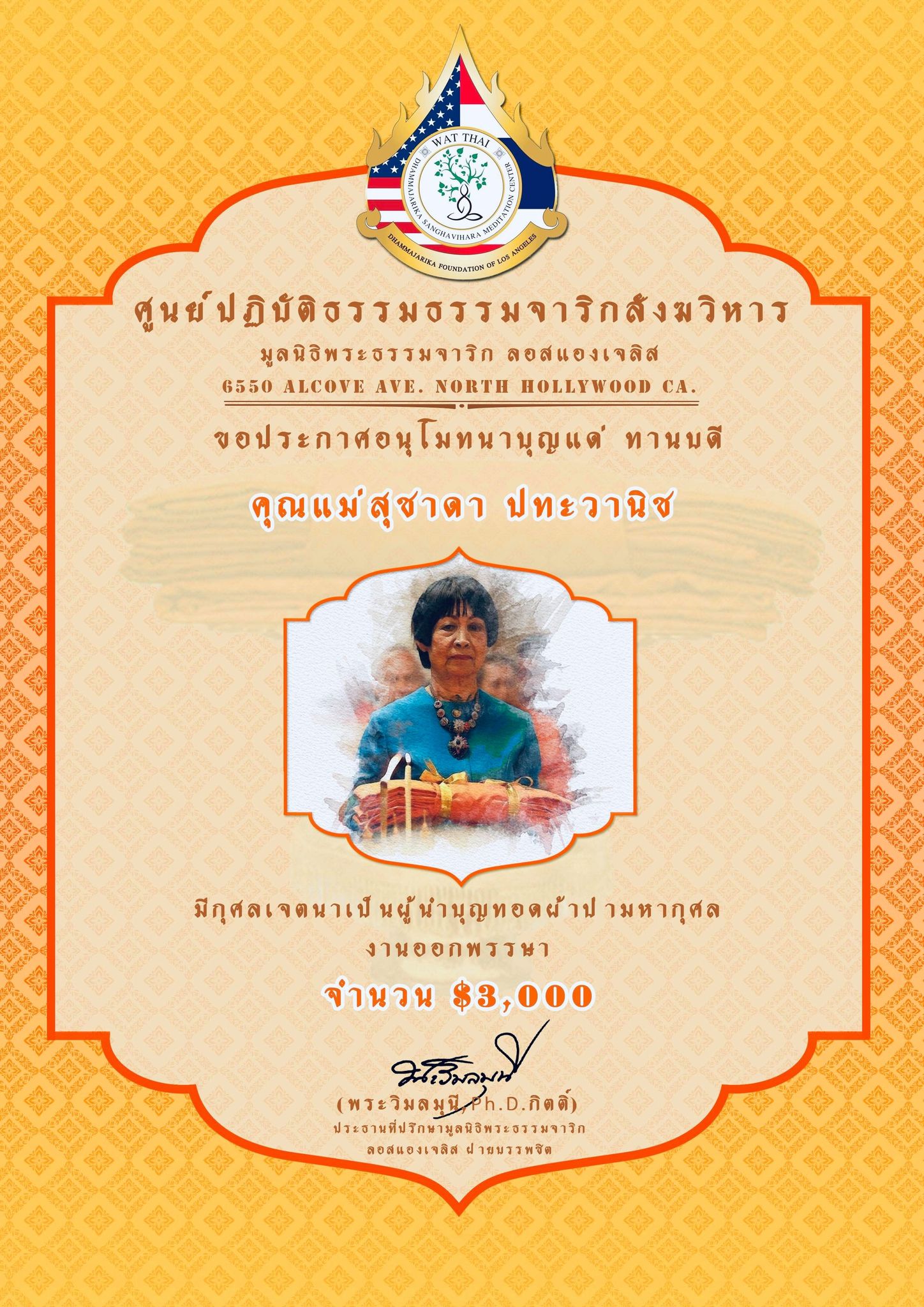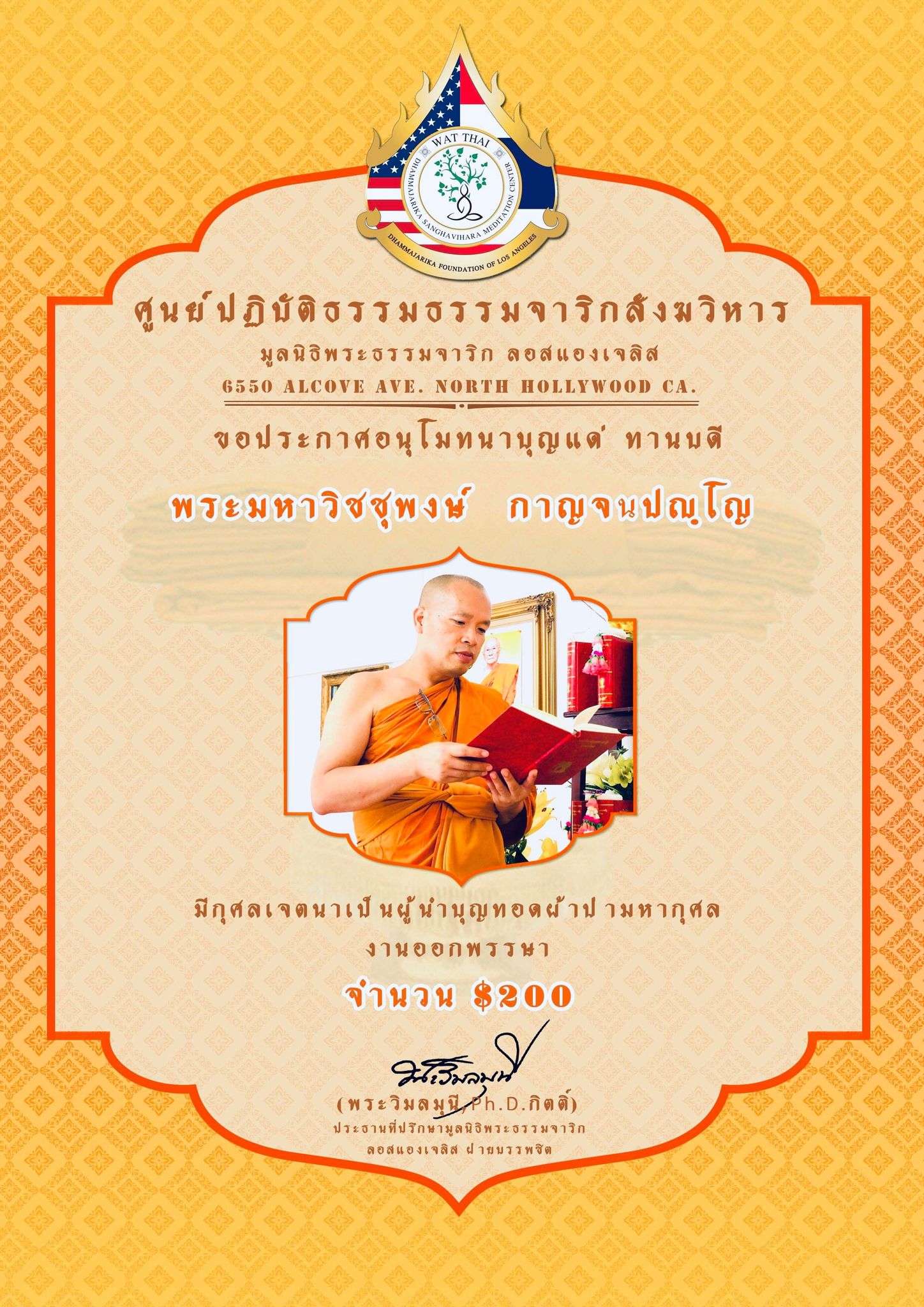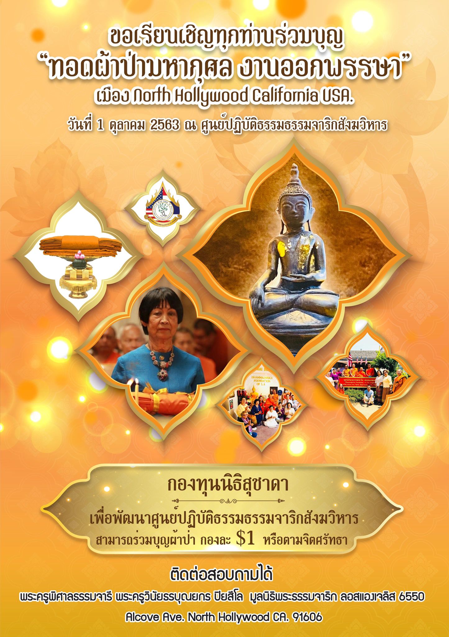ในนามของคณะสงฆ์ คณะอุบาสกอุบาสิกา คณะทำงานศูนย์ปฏิบัติธรรมธรรมจาริกสังฆวิหาร มูลนิธิพระธรรมจาริก ลอสแองเจลิส เมือง North Hollywood California ขอประกาศอนุโมทนาบุญกับทานบดีเจ้าภาพ “คุณแม่สุชาดา ปทะวานิช” ที่รับเป็นประธานงานผ้าป่ามหากุศล วันออกพรรษา กองละ $1 จำนวน 3,000 กอง เพื่อจัดตั้ง “กองทุนนิธิสุชาดา เพื่อส่งเสริมและสนับสนุนการเผยแผ่พระพุทธศาสนาของศูนย์ปฏิบัติธรรมธรรมจาริกสังฆวิหาร” ................................................... ในการนี้ จึงขอเรียนเชิญทุกท่านร่วมบุญ “ทอดผ้าป่ามหากุศล งานออกพรรษา” ในวันพฤหัสบดี ที่ 1 ตุลาคม 2563 ณ ศูนย์ปฏิบัติธรรมธรรมจาริกสังฆวิหาร เมือง North Hollywood California USA. สามารถร่วมบุญทอดผ้าป่า กองละ $1 หรือตามจิตศรัทธา ....................................................... ติดต่อสอบถามได้ พระครูพิศาลธรรมจารี พระครูวินัยธรบุณยกร ปิยสีโล มูลนิธิพระธรรมจาริก ลอสแองเจลิส 6550 Alcove Ave. North Hollywood CA. 91606. www.Dhammajarika.Org