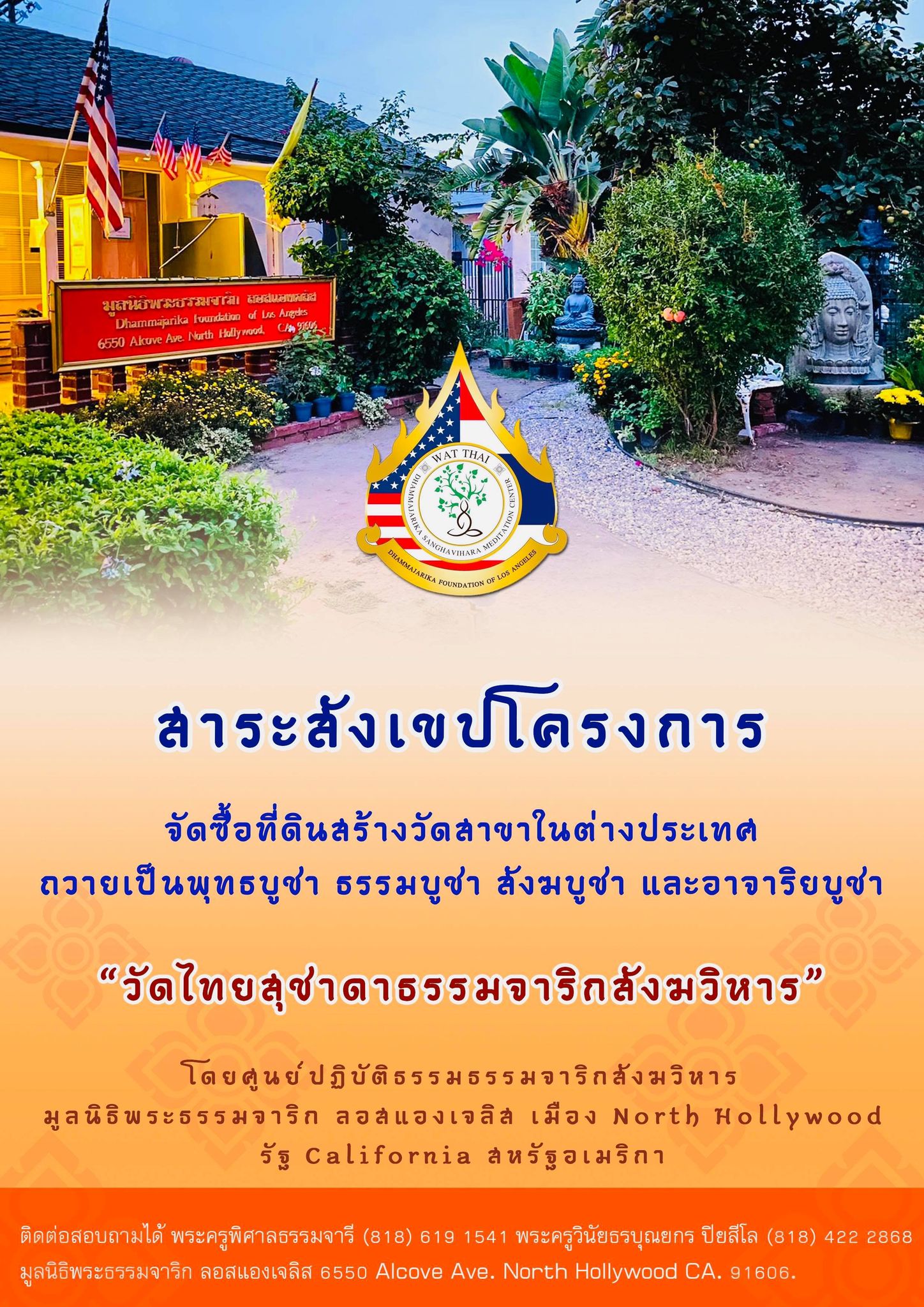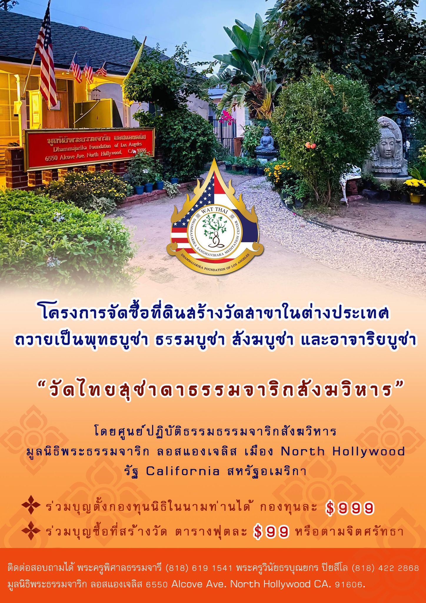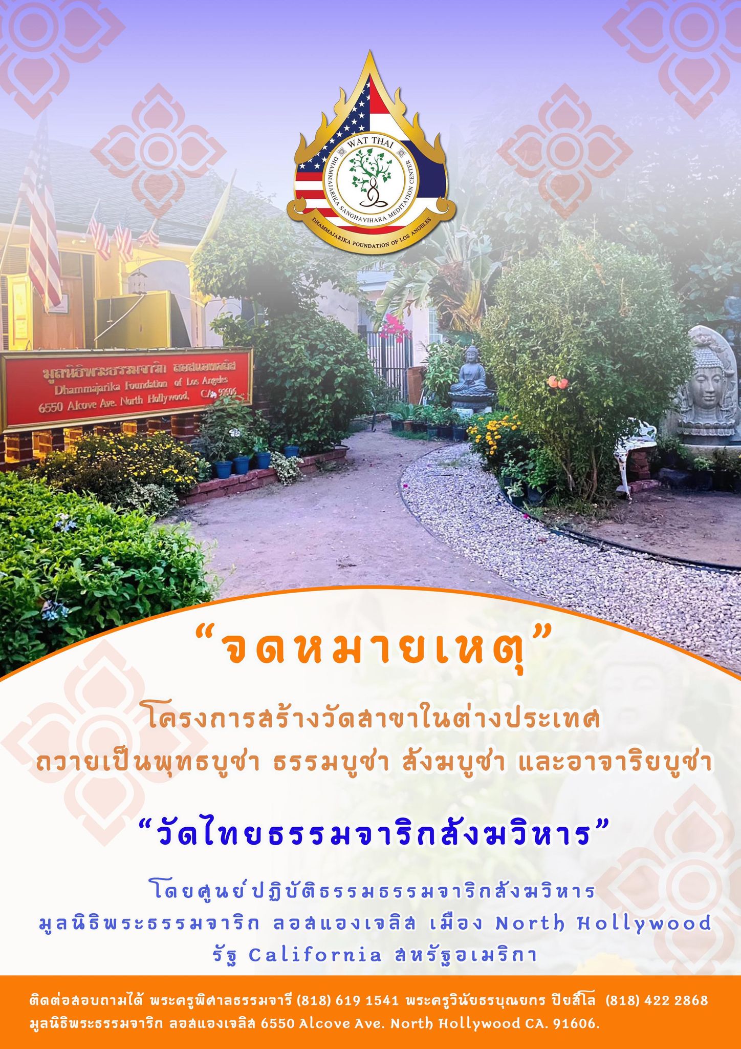 ขอเชิญร่วมเป็นหนึ่งในประวัติศาสตร์สร้างวัดสาขาในต่างประเทศ เพื่อถวายเป็นพุทธบูชา ธรรมบูชา สังฆบูชา และอาจาริยบูชา “วัดไทยธรรมจาริกสังฆวิหาร” ร่วมบริจาคตั้งทุนนิธิในนามท่านได้ ทุนละ$999 หรือร่วมบริจาคปัจจัยสมทบทุนจัดซื้อที่ดิน ตารางฟุตละ $99 หรือตามจิตศรัทธา ติดต่อสอบถามได้ พระครูพิศาลธรรมจารี (818) 619 1541 พระครูวินัยธรบุณยกร ปิยสีโล (818) 422 2868 มูลนิธิพระธรรมจาริก ลอสแองเจลิส 6550 Alcove Ave. North Hollywood CA. 91606. www.Dhammajarika.Org